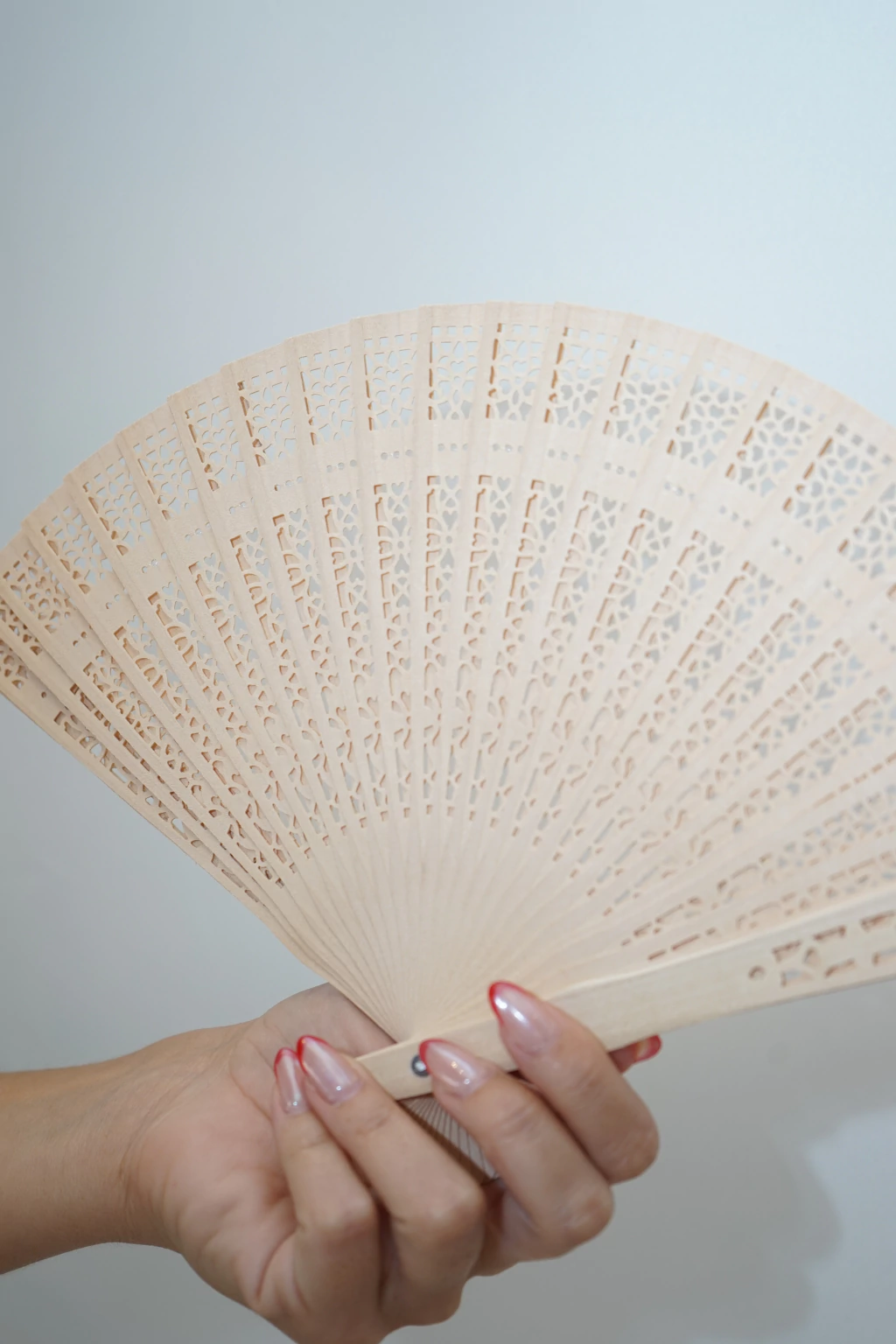 ✔ Diseño: Presenta un trabajo calado artesanal, creando formas delicadas y detalladas que aportan un toque sofisticado y permiten una mejor circulación del aire. Su apertura es fluida y silenciosa.