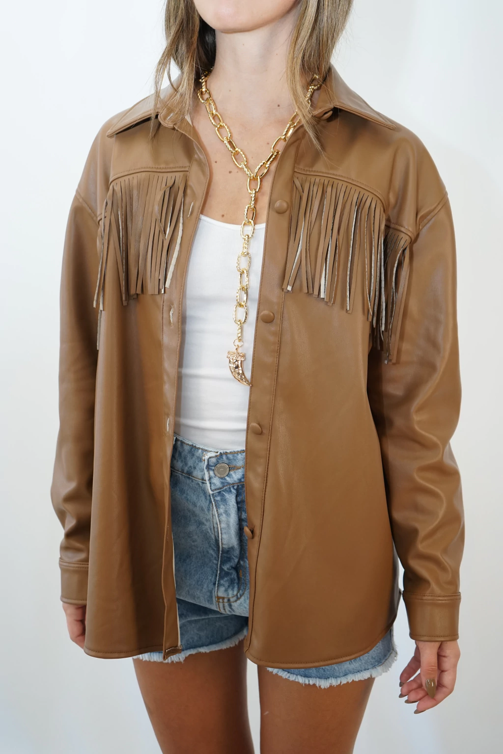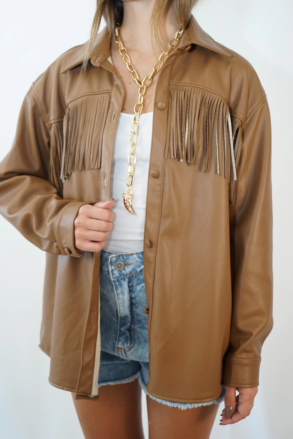 Este camisaco es la pieza clave para un look atrevido y lleno de estilo. Con su diseño único de ecocuero y detalles en flecos en el frente, es la opción perfecta para quienes buscan destacar con una prenda versátil y moderna.
