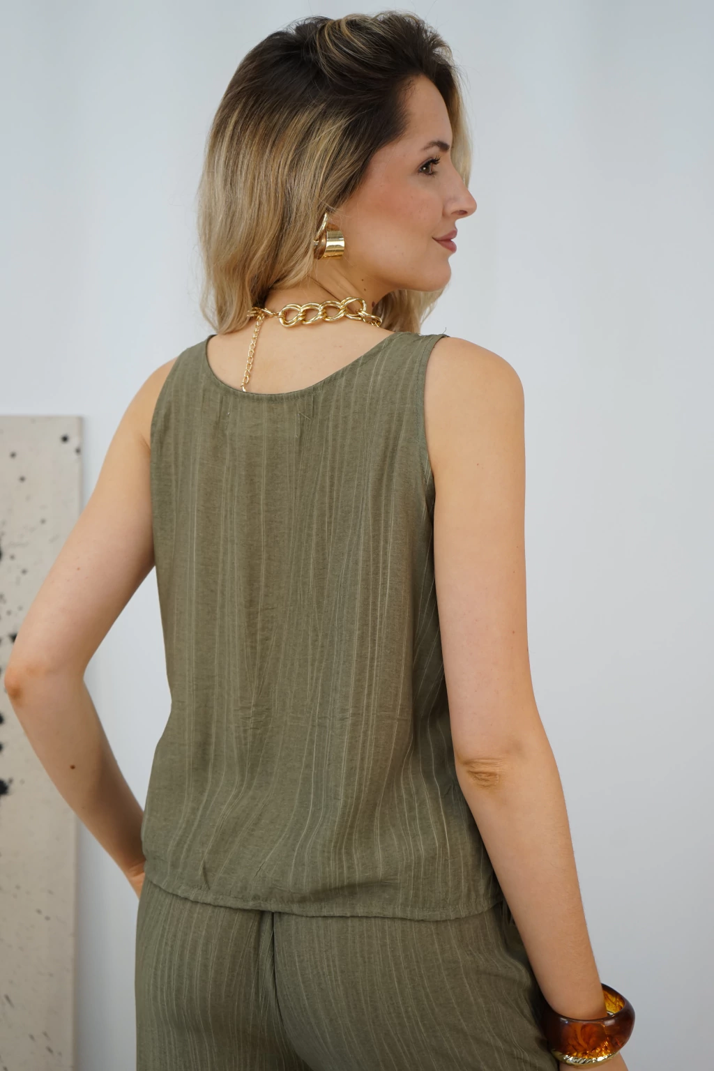 ✔ Material: Textil liviano y fresco, con terminación arrugada que aporta textura y un look relajado.