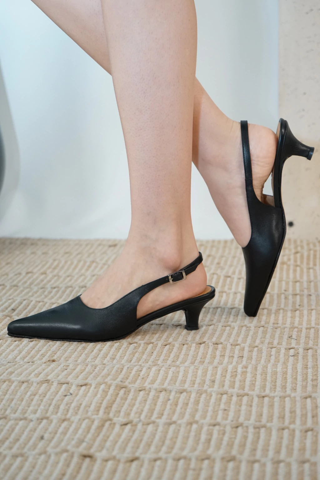 STILETTOS DE CUERO PUNTA FINA CON TACO BAJO Y HEBILLA LATERAL