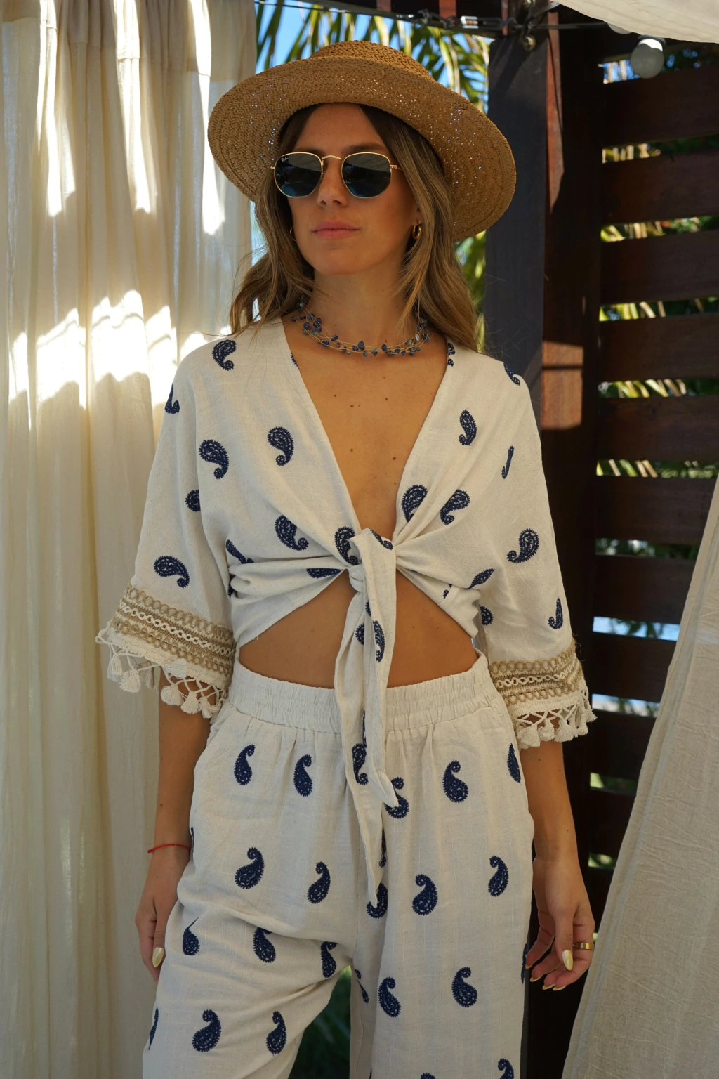 ✔ Detalles: Bordado de arabescos en azul que aporta un aire artesanal y terminación de borlas en mangas que suman movimiento y originalidad.