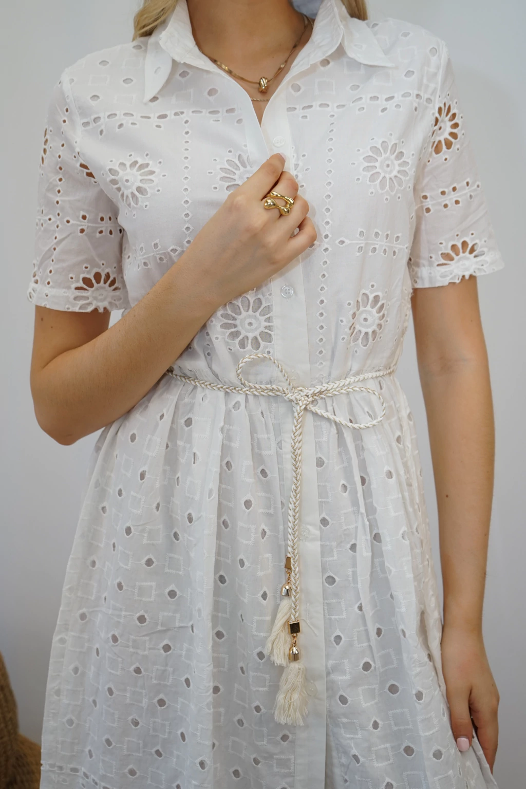 ✔ Diseño: Estilo camisero con mangas cortas y detalle de cordón en la cintura, permitiendo ajustar el calce según preferencia. El brodery aporta textura y un acabado artesanal que realza la prenda.